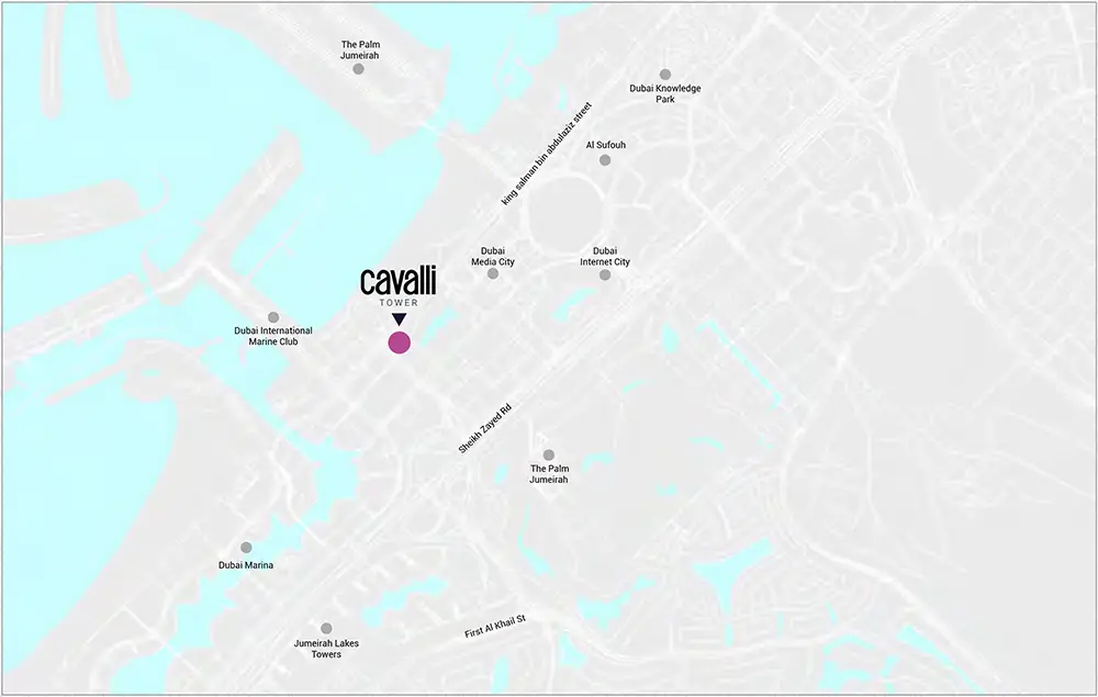 Located in the highly sought-after Al Sufouh and Dubai Marina district, the tower offers residents an unbeatable vantage point, with breathtaking panoramic views of the Palm Jumeirah, Burj Al Arab, and the sparkling Arabian Gulf. Its strategic location provides seamless connectivity to key parts of the city while also placing residents within minutes of Dubai’s finest shopping, dining, leisure, and entertainment hubs. With its position next to Mina Seyahi and direct pedestrian access to a private beach, Cavalli Tower ensures that residents enjoy a unique blend of city life and resort-style waterfront living.