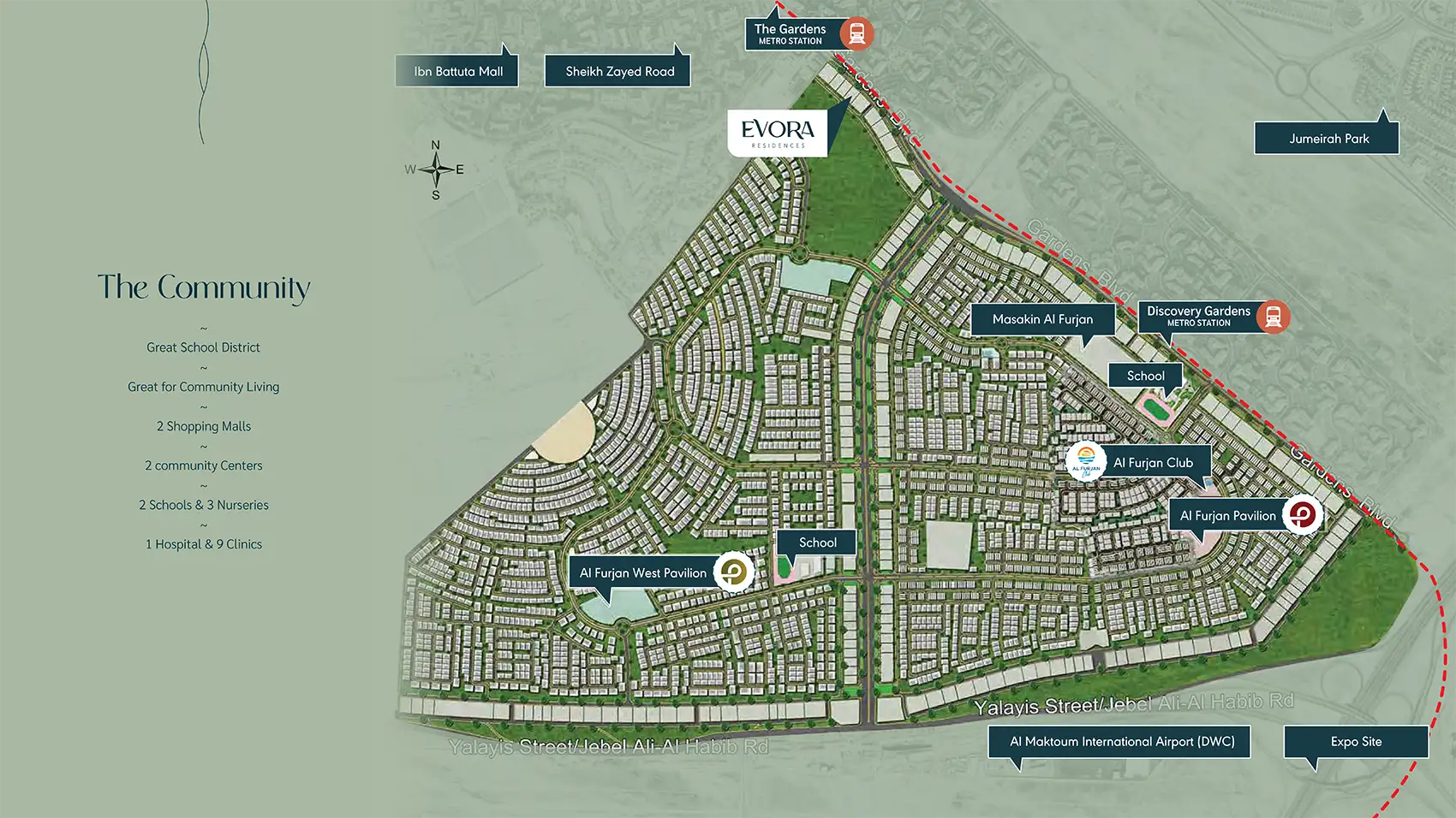 Nestled in a serene corner of Al Furjan, the development offers convenient access to Sheikh Zayed Road, nearby metro stations, Ibn Battuta Mall, and Expo City—ensuring seamless connectivity with Dubai Marina, Downtown Dubai, and international airports.
