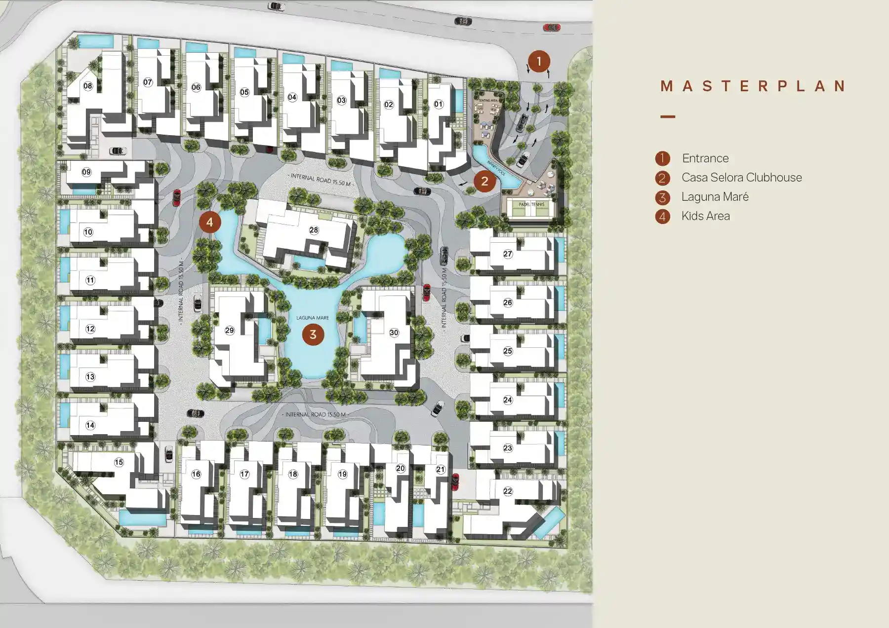 At the heart of the community lies Laguna Maré, a swimmable crystal lagoon with sandy beaches, kayaking, wellness trails, and waterside promenades. The Casa Selora clubhouse offers social lounges, yoga and event spaces, shaded decks, and landscaped gardens. Add to that wellness-oriented outdoor gyms, padel courts, cycling and walking trails, children’s play zones, BBQ gardens, and smart home automation, and you have a thoughtfully integrated upscale living experience tailored for families and investors alike.
