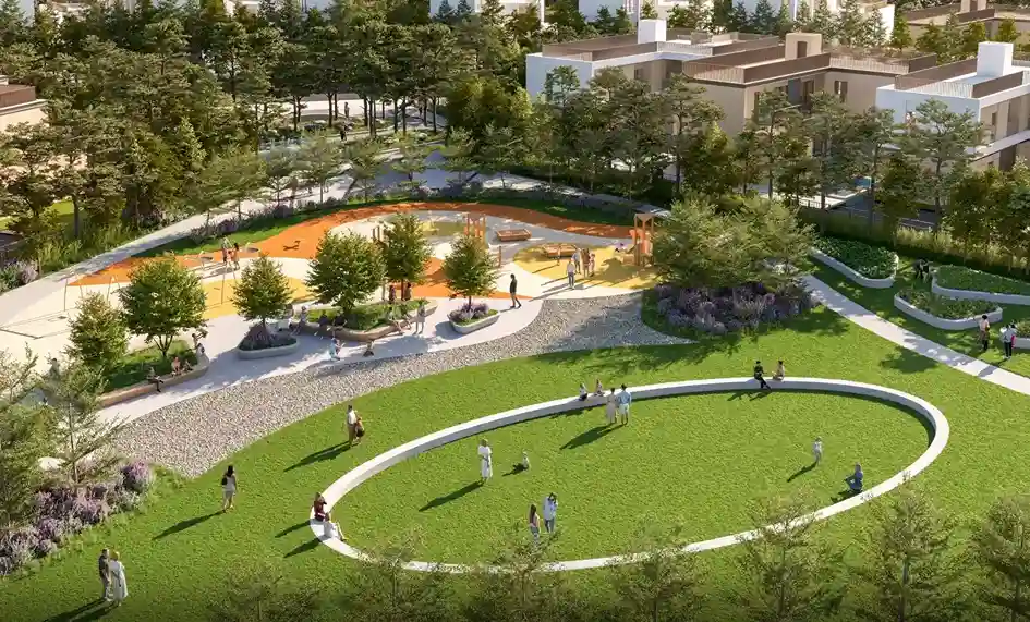 Designed with over 10,000 trees, the community includes a lap pool, splash pads, wellness sanctuary, jogging and cycling tracks, and numerous leisure spaces. A vibrant community center features a clubhouse, adventure trails, sports facilities and multi-purpose event areas — offering a lifestyle that blends luxury, privacy and nature.